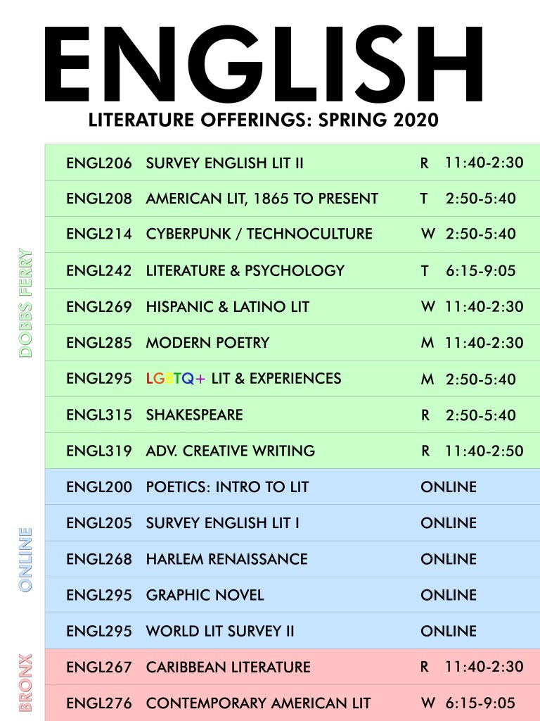 For Spring 2020 the English program is running a variety of major-level courses ranging from traditional offerings in the field, to brand-new and eclectic courses. The spring schedule includes numerous Creative Writing Poetry (ENGL 217), Fiction (ENGL 218), and Non-Fiction (ENGL 219) courses; and many Short Story (ENGL 220) courses too. Refer to the poster below to see more of what’s in store: