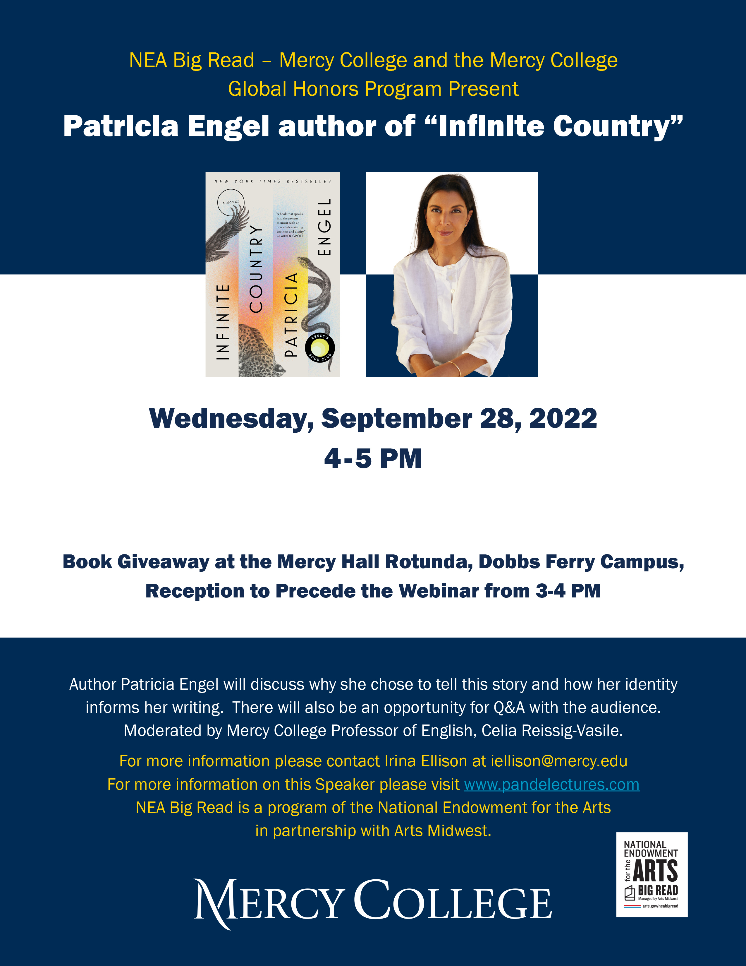 On Wednesday, September 28, Dr. Celia Reissig-Vasile of the Mercy College English Program will be hosting a discussion with author Patricia Engel, regarding her book Infinite Country. Mercy College English majors are strongly encouraged to attend this event; you can attend on zoom, using your own computer, or can join a larger viewing party in the Mercy Hall Rotunda on the Dobbs Ferry campus. Click here to register for the zoom webinar. Or click here if you plan to attend the viewing party in the Rotunda.